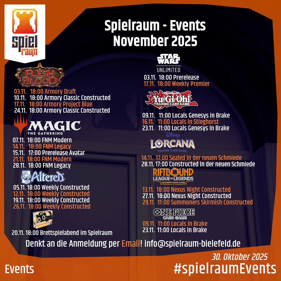 Falls nicht anders vermerkt finden die Events im Spielraum statt